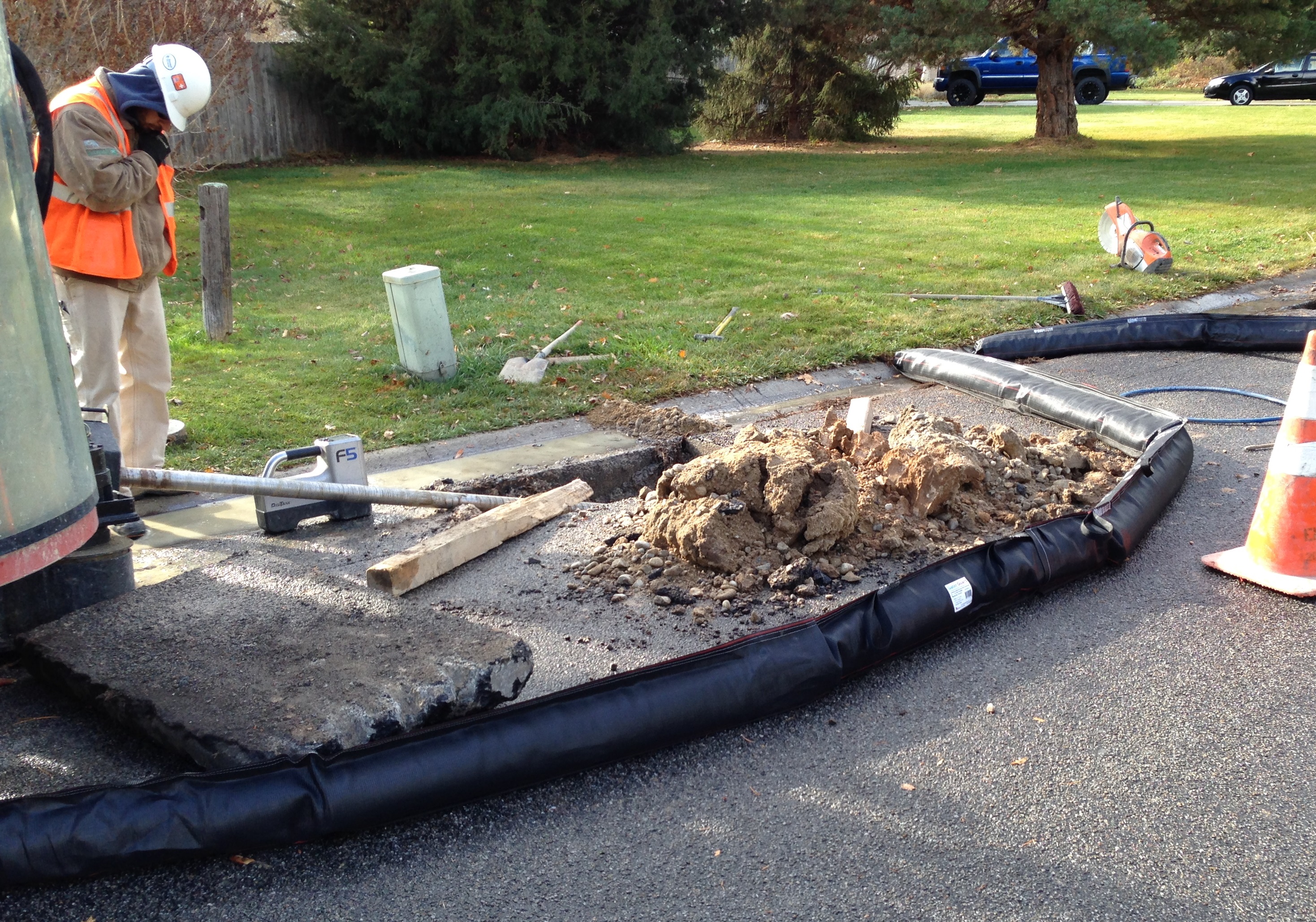 Weighted Gutter Wattles are placed diagonally across the gutter upstream from storm drains to form a small settling pond, allowing the clean-ish water to pass and sediment to drop out.